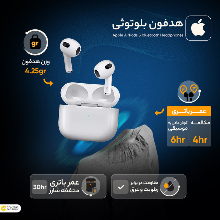 این سری هدفونهای اپل که همواره با طراحی منحصربهفرد و با نام AirPods 3 شناخته میشوند، از نوع توگوشی هستند و میزان بیس و قدرت بالا را به کاربران عرضه میکنند. در آیفون 7 و دیگر محصولات بعد از آن، جک 3.5 میلیمتری صدا که یک ارتباطدهندهی آنالوگ بود، حذف شد. حذف این درگاه با تغییر نوع اتصال و بیسیمشدن ایرپاد همراه بود. طراحی ارگونومیک این محصول باعث شده که هنگام استفادهی بلندمدت از آن هیچگونه احساس خستگی یا درد در ناحیهی گوش خود نکنید. باکس سفید علاوهبر نگهداری از محصول، وظیفهی شارژ آن را هم بر عهده دارد. این هدفون میتواند فقط با یک بار شارژ، تا 6 ساعت شما را در پخش موسیقی همراهی کند. گفتنی است این محصول به چیپست Apple H1 جدید اپل مجهز شده است. لازم به ذکر است که این محصول در مقابل رطوبت و آب مقاوم است و میتوانید با خیال راحت در شرایط جوی متنوع از AirPods 3 استفاده کنید. AirPods 3 به نسبت AirPods Pro قیمت ارزانتری دارد و از داشتن قابلیت Noise Cancellation هم محروم است. اما در بخش طول عمر مفید (زمان آماده بهکار) به ازای هر بار شارژ، توانایی ارائه عملکرد بهتری به نسبت AirPods Pro دارد. این محصول میتواند به ازای هر بار شارژ، طول عمر مفید 6 ساعت را برای پخش موسیقی ارائه کند، این در حالی است که AirPods Pro توانایی ارائه طول عمر مفید 4.5 را برای پخش موسیقی دارد.